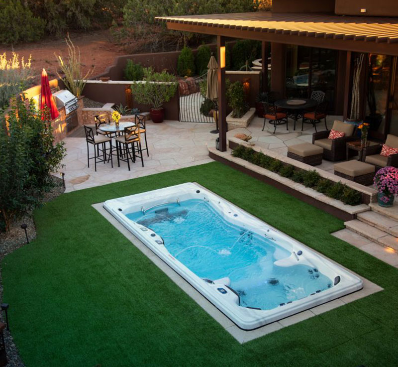 GREAT FOR SMALL SPACES: A swim spa can be installed on a concrete pad or decking (with the right support). With models varying in size from 17 feet long to 19 feet, it’s an ideal fit for almost any yard, large and small.